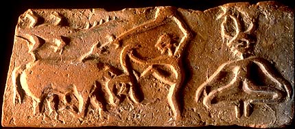 sacrifice scene and a figure seated in yogic position, wearing a