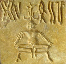 Seven bangles are depicted on the left arm and six on the right, with the hands resting on the knees. The heels are pressed together under the groin and the feet project beyond the edge of the throne. The feet of the throne are carved with the hoof of a bovine as is seen on the bull and unicorn seals. The seal may not have been fired, but the stone is very hard. A grooved and perforated boss is present on the back of the seal.