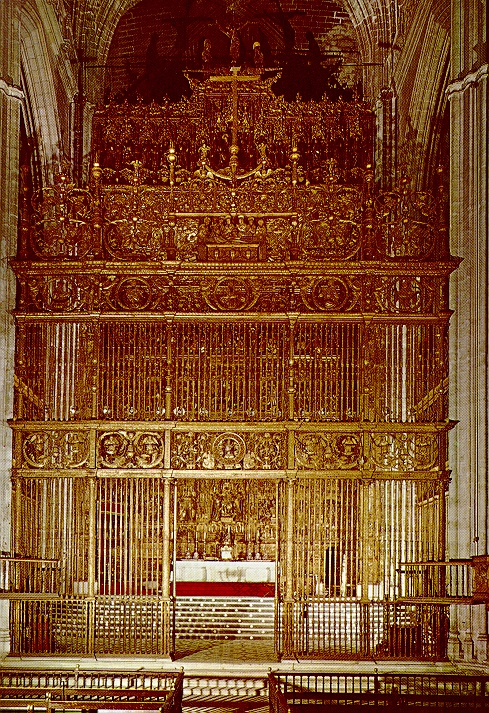 Es común ver verjas de hierro (iron grating) en las iglesias españolas. Aquí hay un ejemplo muy dramático: el altar mayor de una de las catedrales más grandes e impresionantes del mundo: Sevilla.