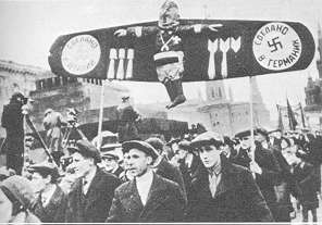 Rusia, o mejor dicho, la Unión Soviética, era uno de los países más aliados con la República al principio del conflicto. Aquí hay una manifestación en Moscú en que la gente se burla de Franco. Dice "hecho en Italia" y "hecho en Alemania," dos países en favor de Franco y su rebelión.